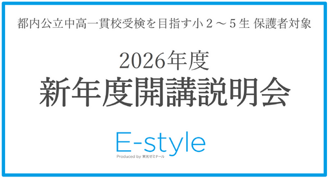 株式会社増進会ホールディングス(Z会グループ)のグループ会社、株式会社栄光(本社:東京都千代田区 代表取締役社長:下田勝昭)が運営する、都立中高一貫校と最難関都立高校対策専門塾「E-style Produced by 栄光ゼミナール」は、都内公立中高一貫校をお考えの現小学2年生~5年生の保護者を対象に、「2026年度【小学部】新年度開講説明会」を2025年10月・11月に実施します。