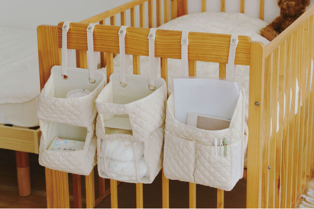 ベビーベッドにかけて使用できるループ付きで、おしりふきやおむつ、