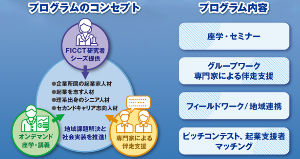 本プログラムは、大阪大学FICCT拠点が主催し、研究者・起業家人材・エンジニアがチームを組み、若手卓越研究者の先端研究成果の社会実装を見据えた事業企画を行う活動です。