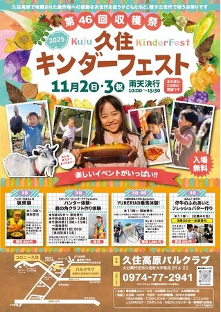 イベント名:第46回収穫祭「久住キンダーフェスト」日 時:2025年11月2日(日)・3日(月・祝)10:00~15:30 ※雨天決行