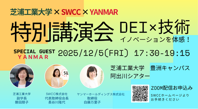 SWCC株式会社(神奈川県川崎市/代表取締役 CEO 社長執行役員 小又哲夫)と芝浦工業大学(東京都江東区/学長 山田純)は、芝浦工業大学豊洲キャンパスにてヤンマーホールディングス株式会社(大阪府大阪市/代表取締役社長 山岡健人)からゲストをお招きし、特別講演会:DEI×技術がイノベーションを創出することを体感しよう!「芝浦工業大学×SWCC×ヤンマーでシナジーを生む」を開催いたします。