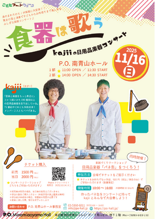 株式会社シアターワークショップ(東京都渋谷区、代表取締役:伊東正示)が受託運営するP.O.南青山ホール(所在地:東京都港区)にて、2025年11月16日(日)に『食器は歌う ~kajiiの日用品楽器コンサート~』を開催いたします。