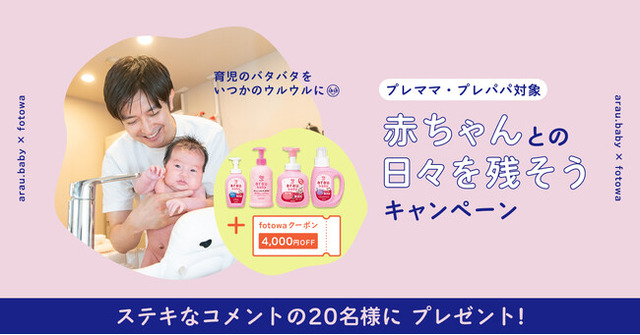 <概要>もうすぐ始まる赤ちゃんとの暮らし。沐浴をしたり、ミルクをあげたり、眠い目をこすりながらお世話をしたり。そんな“当たり前のようでかけがえのない”時間も、気づけばあっという間に過ぎていきます。fotowaとアラウ.ベビーは、出産を控えるママ・パパが「今しかない日常」を大切に残せるよう応援したいという想いから本キャンペーンを企画しました。20年前から多くのママパパに支持される赤ちゃんのための無添加ブランド「アラウ.ベビー」と、赤ちゃんとの日常を撮影できる「ライフスタイルニューボーンフォト」の出張撮影体験をセットで抽選20名様にプレゼントいたします。