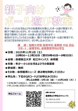 島根県立大学松江キャンパスでは、親子向けボール遊び教室(女児とその保護者対象)を11月1日(土)に開催します。本イベントは、親子で一緒にボールを使った遊びやサッカーを行います。家庭でも簡単にできるボール遊びもお伝えします。ぜひ皆様ご参加ください。