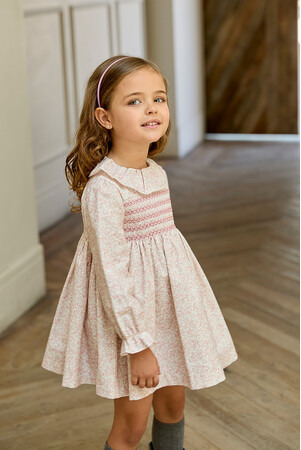 やわらかな色味の花柄に豪華に施されたスモッキング刺繍が上品。