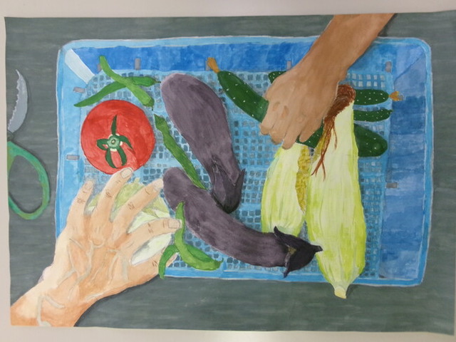 今回は「田・畑で働く人」をテーマに、市内の小学生が描いた作品を展示。