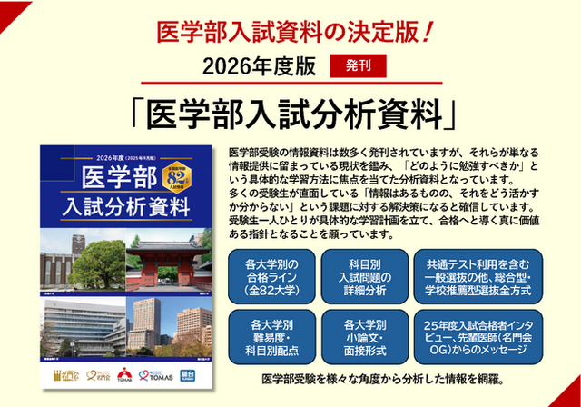株式会社リソー教育グループ(本社:東京都豊島区、代表取締役:天坊真彦)の子会社である、株式会社名門会(本社:東京都豊島区、代表取締役:吉田信司)が、「無料個別学習相談」を受けた方限定で2026年度版「医学部入試分析資料」を全員に無料でプレゼントいたします。