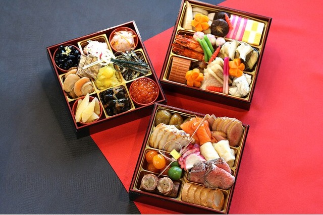 壱の重黒豆金箔飾り、蛸あぶり、紅白なます、帆立旨煮、栗きんとん、田作り、数の子、鰊昆布巻き、いくら醬油漬け、のし梅