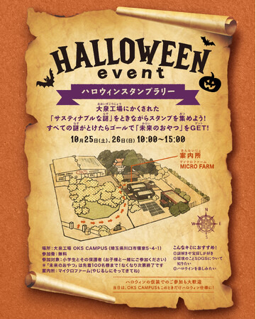 株式会社大泉工場(本社:埼玉県川口市、代表取締役:大泉 寛太郎)は、本社敷地「OKS CAMPUS」を会場に、10月25日(土)と26日(日)の2日間、お子様向けイベント「謎解きハロウィンスタンプラリー」を開催します。また、2025年10月15日(水)から10月31日(金)の期間中は会場内をハロウィン仕様に装飾。