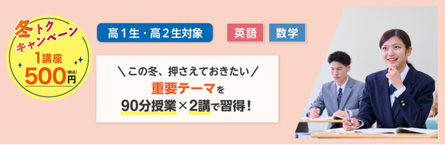 河合塾は高1・2生を対象とした冬期講習「冬トクキャンペーン」の受付を開始しました。押さえておきたい重要テーマをワンコインで短期習得できる「ダイジェスト講座」をはじめ、冬から塾で学習を始めたい高1・2生を応援する内容を展開します。
