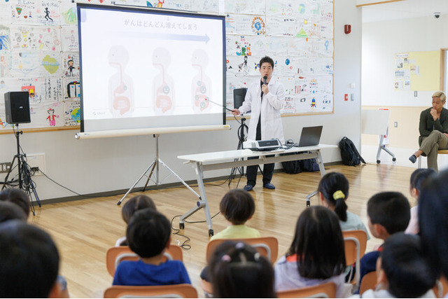 「今日はがんの話をします。(誰もが)がんになる可能性があるという話、なったときにどうすればよいのかという話です。がんの話について、みんなの大好きなお父さんお母さんおじいちゃんおばあちゃんに伝えてほしいと思っています。」