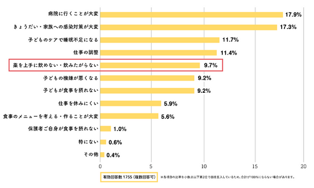 Q.お子さんが病気になった時に特に困ることは何ですか?(複数回答可)[画像2: https://prcdn.freetls.fastly.net/release_image/13640/3381/13640-3381-072b0af53bbfb2d512965652d3086660-2286x1366.png?width=536&quality=85%2C75&format=jpeg&auto=webp&fit=bounds&bg-color=fff ]