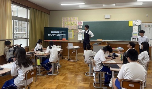 その事前学習の一環として、同校より桑原組へ「職場で必要とされるマナー・姿勢を伝えてほしい」との依頼を受け、取締役副社長の桑原勇人と高島鉱建株式会社の営業部課長上原一晃が講師として登壇、体験学習を実施いたしました。