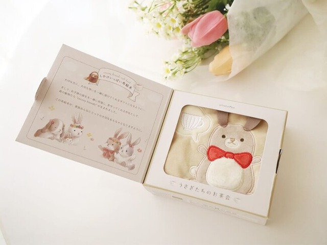 『ふんわりえほん うさぎたちのお茶会』は、やさしいくすみカラーとふんわりした質感が特徴の布絵本です。1.赤ちゃんが口に入れても安心な素材設計