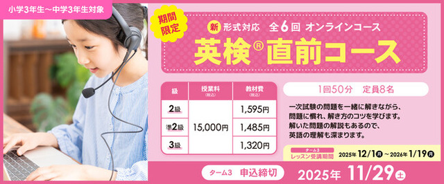 英会話教室を運営する株式会社イーオン(本社:東京都新宿区、代表取締役社長:重野卓、以下「イーオン」)は、2026年1月25日(日)に行われる英検(R)に向けて、オンライン校のキッズクラス及び高校生以上のクラスで「英検(R)対策直前コース」を開講します。本コースでは、一緒に一次試験の問題を解きながら問題に慣れ、解き方のコツを学びます。解いた問題の解説もあるので、英語の理解も深まります。