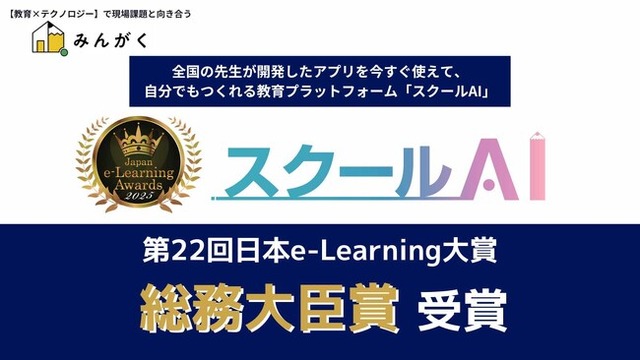 株式会社みんがく(本社:東京都新宿区、代表取締役:佐藤雄太、以下みんがく)が提供する、教育向け生成AIプラットフォーム「スクールAI」が、第22回日本e-Learning大賞において、「総務大臣賞」を受賞いたしました。