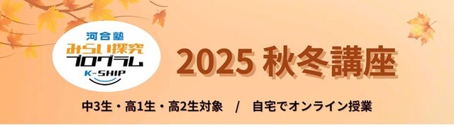 学校法人河合塾は、全国の中3生・高1生・高2生を対象に「みらい探究プログラム K-SHIP」をオンラインで開催します。受験勉強が本格化する前の今秋、英語や数学の教科講座のほかに、総合型選抜にも役立つ表現力を養う講座や、教科「情報」を本質的に理解できる講座など、学びをじっくり深めていただける8講座をご提供します。