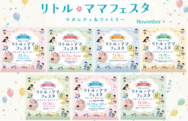 国内最大規模の親子フェスタを開催する株式会社エンファム.は、11月1日(土)京都、11月2日(日)・3日(月・祝)八王子、11月8日(土)北九州・青森、11月15日(土)札幌、11月21日(金)・22日(土)名古屋、11月22日(土)高崎の7都市にて、親子向けイベント【リトル・ママフェスタ】を開催いたします。会場では、親子で一緒に楽しめるステージや、毎回大人気のキッズレース、おひるね・おすわりアート撮影会(事前予約制)など、笑顔あふれる体験型プログラムをご用意。ママ・パパとお子さんの"思い出づくりの場"として、ご家族皆様でお楽しみください。