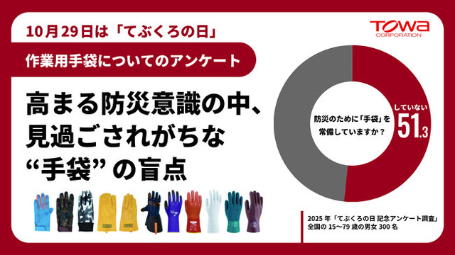 作業用手袋の総合メーカー 株式会社東和コーポレーション(本社:福岡県久留米市、代表取締役社長 渡辺聡、以下 東和)は、毎日人々の手を守り続けている「働く手袋」にもっと関心をもってもらうことを目的として2010年に「てぶくろの日(10月29日)」を制定し、毎年この時期に記念アンケート調査を実施しています。このたび16回目となる2025年の結果をご報告いたします。