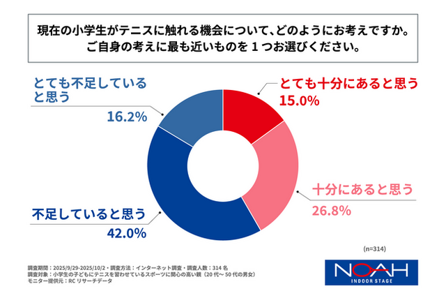 ノアインドアステージ株式会社(本社:兵庫県姫路市、代表取締役社長:大西 雅之)が運営する「テニススクール・ノア」は、小学生の子どもにテニスを習わせているスポーツに関心の高い親(20代~50代の男女)を対象に「小学生の子どものテニス体験機会に関する調査」を実施しました。この調査から、小学生の子どもにテニスを習わせているスポーツに関心の高い親が小学生のテニスの体験機会をどう捉えているかや子どものテニススクールを選ぶ際に重視したことなどが明らかになりました。