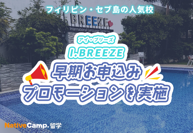 ネイティブスピーカーと回数無制限のオンライン英会話サービス「ネイティブキャンプ英会話」を展開する株式会社ネイティブキャンプ(東京都渋谷区 代表取締役: 谷川国洋)は、海外留学エージェントサービス「ネイティブキャンプ留学」において、フィリピン・セブの人気校「I.BREEZE」で早期お申込みプロモーションを実施いたします。