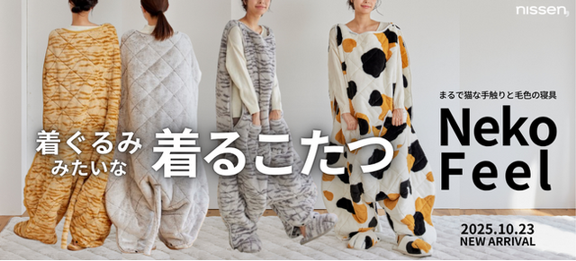 株式会社ニッセン(本社:京都市南区、代表取締役社長:羽渕淳)は、オリジナル寝具ブランド「猫Feel (以下、猫フィール)」の新商品「着ぐるみこたつ」を、ニッセンオンラインショップ(https://www.nissen.co.jp/) で10月23日(木)より販売開始いたします。また、発売を記念して新商品をご購入いただいた方に、非売品「猫Feelポーチ」をプレゼント(先着300個)。詳細についてはキャンペーンページをご確認ください。