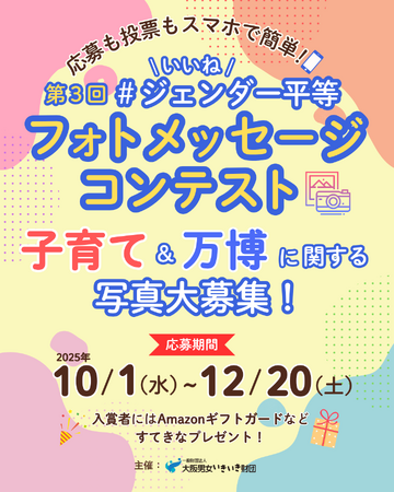 一般財団法人大阪男女いきいき財団では、ジェンダー平等実現に向けたフォトメッセージコンテストを今年度も開催します。「いいね!」と言いたくなる、メッセージ性のある写真とハッシュタグやエピソードコメントを通じて、市民の方々が多彩なアイデアや価値観に触れる機会をめざしています。