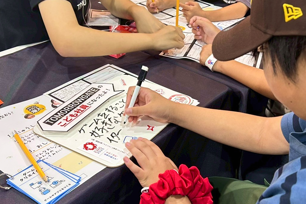 本イベントは、EXPO2025大阪・関西万博の会場「EXPOメッセWASSE」にて実施され、万博期間ラストを飾る2日間で延べ約2.4万人が来場。トゥモローゲートのブースには多くの親子が訪れ、子どもたちが“こども社員”としてオフィスを探検し、自分の夢を詰め込んだ名刺を制作。結果、約200人分の夢が集まり、体験後アンケートでは98%が「働くことが楽しみになった」と回答しました。