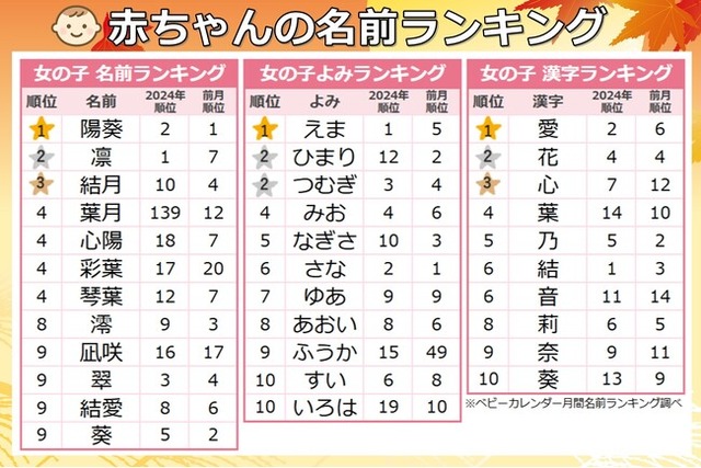 2025年9月生まれ 女の子に人気の名前ランキング|ベビーカレンダー月間名前ランキング調べ