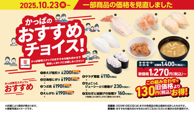 コロワイドグループのかっぱ寿司(カッパ・クリエイト(株) 本社:神奈川県横浜市、代表取締役社長:山角豪)は、2025年10月23日(木)より一部商品の価格を改定いたします。今回の価格改定は、より多くのお客様に「おいしさ」と「満足感」をお届けするための取り組みです。