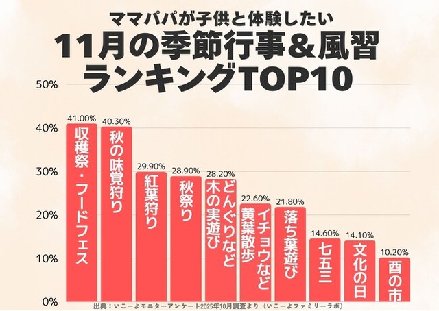 今回の調査では、11月に家族で「秋の実り」を楽しみたいと考える家庭が多いことが明らかになりました。収穫祭や味覚狩り、紅葉狩りなど、自然や食が結びついた体験は、親子の学びや思い出づくりの場にもなっています。いこーよファミリーラボでは、今後も季節行事を通じて「親子のライフスタイル事情」をを発信していきます。