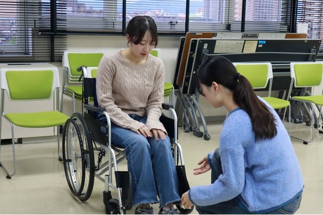 約2時間にわたる講座では、車いす利用者や視覚障がいのある方への対応を中心に、体験と実技を交えて学びました。車いす介助の演習では、学生たちが実際に車いすを押したり、利用者役として乗ってみたりしながら、声かけや姿勢、角度などを確認。「車いす利用者の目線に合わせて会話する」「声をかけるタイミングを大切にする」など、細やかな気配りが求められることを実感しました。