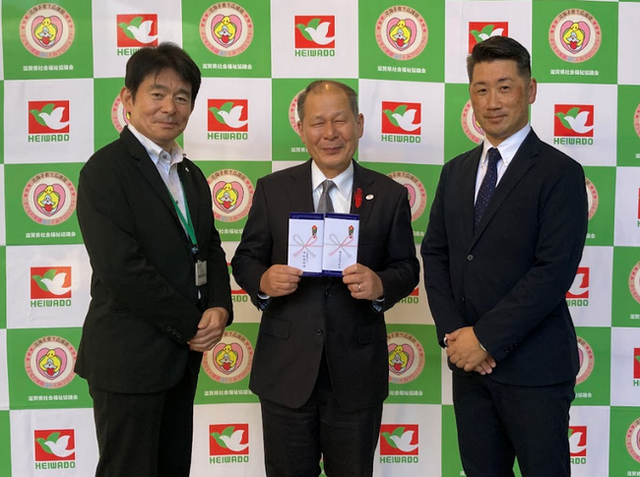平和堂店頭募金ならびに平和堂財団よりの寄附(写真左から)平和堂財団 常務理事 千秋 章造、滋賀県社会福祉協議会 会長 市川 忠稔 様、平和堂 総務部総務課長 西 政明