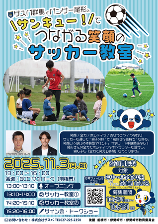 このたび、株式会社ザスパは11月3日(月祝)に『ザスパ群馬とパンサー尾形の“サンキュー!”で繋がる笑顔のサッカー教室』を開催することになりましたので、お知らせいたします。当日はお笑い芸人のパンサー尾形さんが笑顔のサッカー教室を実施いたします。