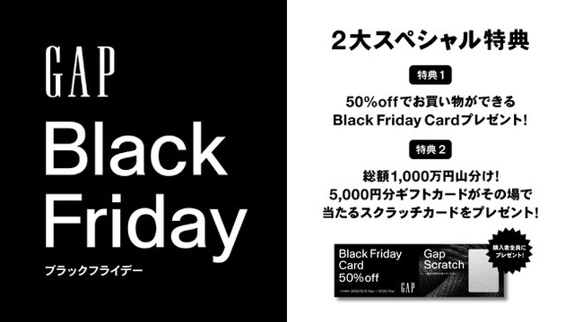 2025年11月20日(木)~12月1日(月)のブラックフライデー期間中、全国のGapストアと公式オンラインストア、Gap Outletストアでご購入されたお客様全員に、2025年12月2日(火)~12月25日(木)までのお買い物が50%OFFとなる「Black Friday Card」をプレゼントいたします。