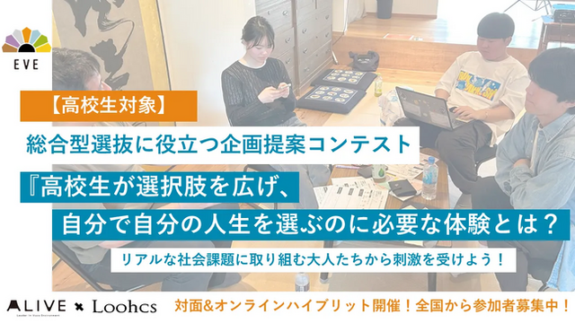 総合型選抜・AO入試専門塾のルークス志塾を運営するLoohcs株式会社(代表取締役:嶺井祐輝以下「ルークス」)と、日本最大級の異業種混合型リーダーシップ開発プロジェクトを提供する一般社団法人ALIVE(代表理事:庄司弥寿彦、以下「ALIVE」)は、高校生企画提案コンテストEVE第5期生の募集を開始します。