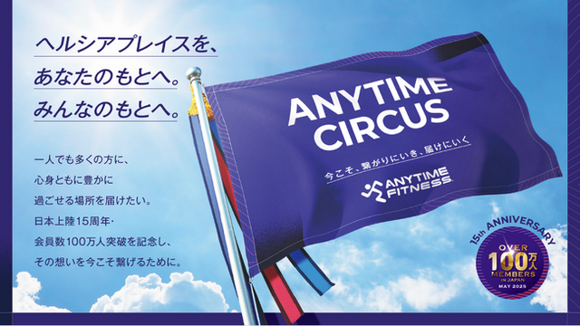 24時間年中無休のフィットネスジム「ANYTIME FITNESS(エニタイムフィットネス)」の国内マスターフランチャイジーとして、全国で直営店舗の運営およびフランチャイズ展開を中核事業とする株式会社 Fast Fitness Japan (本社:東京都新宿区、代表取締役社長:山部清明、以下当社)は、本日より「会員100万人突破&日本上陸15周年記念プロジェクト」を実施いたします。本プロジェクトでは「ヘルシアプレイスを、あなたのもとへ。みんなのもとへ。」というメッセージのもと、「ANYTIME CIRCUS(エニタイム サーカス)」と題して日本全国にてエニタイムフィットネス会員の皆様や地域の方々と一緒に様々な企画を実施いたします。