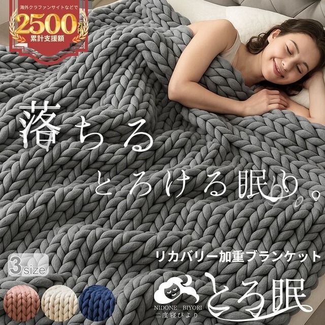第一弾として登場するリカバリー加重ブランケット「とろ眠」は、重みが3kg/5kg/7kgから選べる加重タイプ。チャンキーニットを用い、職人の手によって一本一本丁寧に編み込まれています。