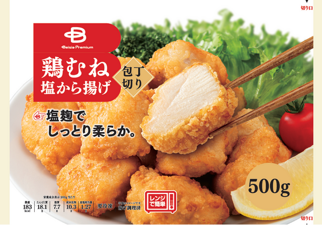 お客様からの支持が高い冷凍からあげカテゴリーにおいて、PBのラインナップの拡充として鶏むね肉を使用した商品の開発に着手。「ヘルシーだけどパサつく」という鶏むね肉のイメージを覆すため、塩麴を使用し、しっとりジューシーな食感を実現しました。包丁切りで丁寧にカットされた鶏むね肉は、食べ応えも抜群。また、社内アンケートでの意見を踏まえ、衣を薄くすることで旨味と食感が最大限に引き立つよう改良し、“フワサク”な食感をお楽しみいただけるようにしました。