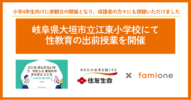 「子どもを願うすべての人によりそい 幸せな人生を歩める社会をつくる」をビジョンに掲げ、法人の従業員向け福利厚生や自治体の住民向け支援を行うヘルスケアサポートサービス「ファミワン」 https://famione.com/benefit/ などを展開する株式会社ファミワン(本社:東京都渋谷区、代表取締役:石川勇介)は、2025年9月に住友生命保険相互会社(本社:大阪府大阪市、取締役 代表執行役社長:高田 幸徳)との協業に関するプロジェクトの一環として、性教育に関する出前授業を、岐阜県の大垣市立江東小学校4年生に向けてオンライン開催しました。