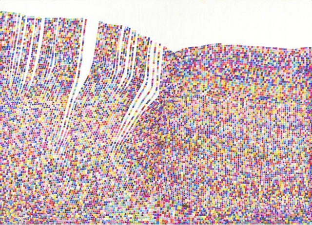 学校に行けず暇を持て余していた時期に、作家の母が「マルを描いて」と紙とペンを渡したのが創作のはじまり。マルというモチーフが彼女のなかでピタリとはまり熱中するようになる。マルを描き始めて5年になるが、近年はマル以外のモチーフも描くようになり、マル、サンカク、シカクのモチーフを大きなカンバスに日々飽きることなく描き続ける。コミュニケーションとして発する言葉はわずかだが、頭に浮かんだであろう言葉を繰り返し呟き、言葉と一緒に作品が生まれることもある。