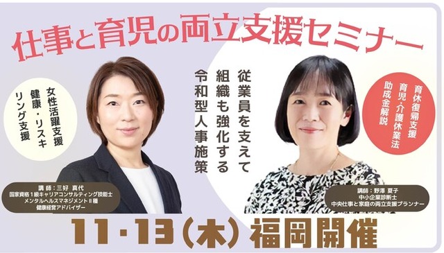 厚生労働省委託事業 キャリア形成・リスキリング推進事業は、この度、令和7年度中小企業育児・介護休業等推進支援事業(厚生労働省委託事業)と共催し、11月13日(木)に福岡県福岡市にて「仕事と育児の両立支援セミナー」を実施します。