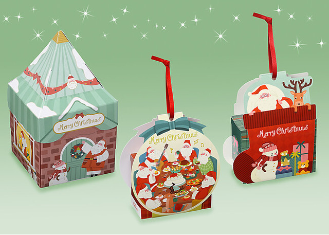 特長:スノードームをイメージしたボックスに、2種のクッキーをアソートしました。正面はサンタさんたちがパーティーをしている様子が、裏面は子どもたちへプレゼントを届けに行くサンタさんとトナカイのデザインが楽しめます。