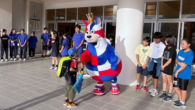 10月22日(水)に訪問した本部町の上本部学園は、これまで実施したあいさつ運動で最北端の訪問先となりました。活動地域が広がり、より多くの子どもたちと触れ合う貴重な機会となりました。また、児童会や生徒会の皆さんのあいさつ運動に参加し、ゴーディーとハイタッチをして教室に向かう子や、ゴーディーを撮影しあいさつ運動がさながら撮影会のようになる学校もあり、どの学校も笑顔あふれる楽しい時間となりました。
