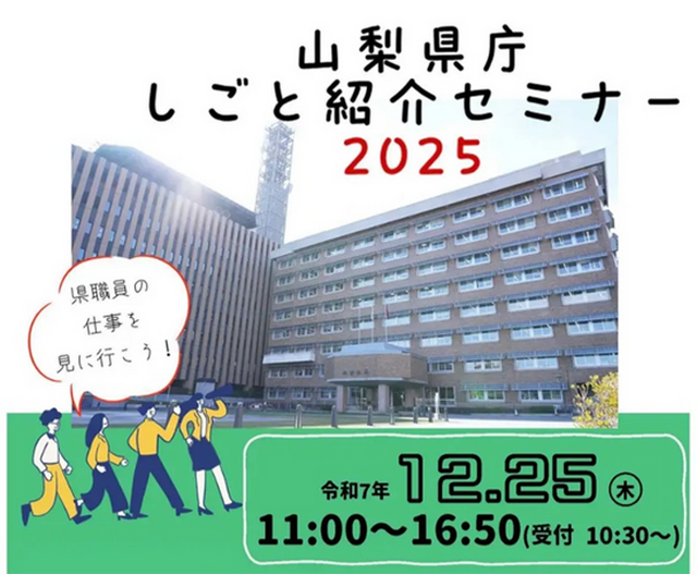 山梨県(知事:長崎 幸太郎)は、学生の冬休みに合わせ、県職員の仕事や魅力、やりがいなどについて理解を深めるとともに、職場の雰囲気を直接体感できるイベント「山梨県庁しごと紹介セミナー2025」を開催します。