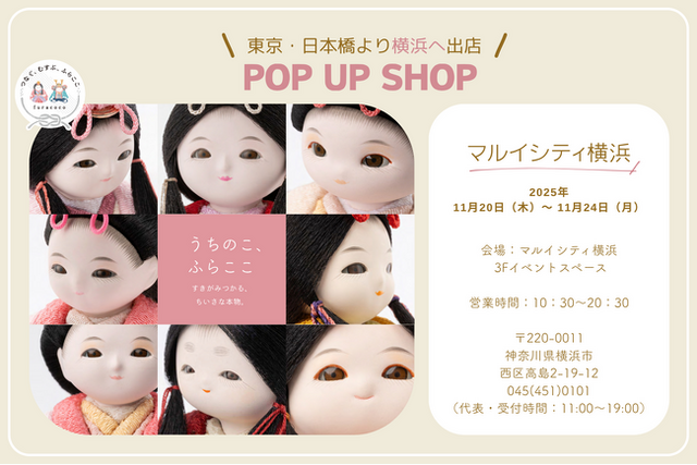 小さくかわいい赤ちゃん顔の雛人形や五月人形づくりのリーディングカンパニーである人形工房ふらここは、2008年に創業以来、Web限定で販売してまいりましたが、子供が生まれたばかりのママの支持を得て、累計販売数は6万5千セットを突破いたしました。「赤ちゃんのように愛らしいお顔」と「コンパクトで飾りやすいデザイン」で多くのママたちの人気を集めてきた人形工房ふらここが、2025年11月20日(木)~24日(月)の期間限定で、マルイシティ横浜 3F イベントスペースにて雛人形POP UP SHOPを開催いたします。ふらここが年内に横浜エリアで雛人形POP UP SHOPを開催するのは、初めての取り組みです。