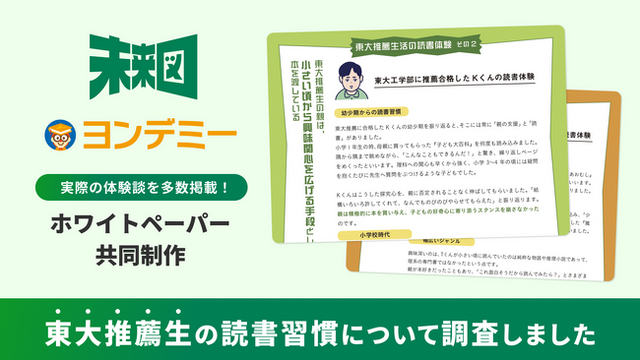 子どもが読書にハマるオンライン習い事「ヨンデミー」を運営する株式会社Yondemy(本社:東京都渋谷区、代表取締役:笹沼 颯太)は、教育情報に特化したメディア「未来図」(本社:東京都新宿区、代表:孫 辰洋)と共同で、東京大学の学校推薦型選抜(以下、推薦入試)合格者の読書習慣を分析したホワイトペーパーを作成・公開しました。