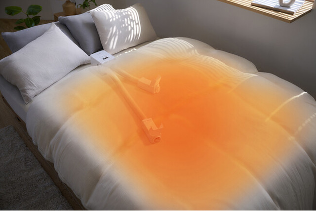 今回発売する「ふとん乾燥機 カラリエmini TURBO ツインノズル」は、あたためモードを選択し、シングルふとんにノズル2個を入れた場合、最速約2分(※1)でふとんをあたためられるハイパワーモデルです。就寝前の短い時間でもあたたかいふとんを用意でき、夏の湿気や寝汗、冬の寒い夜など、季節を問わず快適な就寝環境を実現できます。また、当社独自の立体ノズル※5に加え、吹き出し口の形状を従来品から変更することで、風の直進性を高め、足元から効率的にあたためる設計を採用しています。さらに、ハイパワーでありながら、従来品と比べ約1/2(※2)のコンパクトなサイズで、クローゼットやベッド下など、限られたスペースにも収納できます。