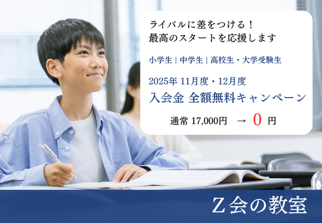 株式会社増進会ホールディングス(Z会グループ)のグループ会社である株式会社Z会エデュースは、「Z会の教室」において、11月度・12月度に新規ご入会の方限定で入会金17,000円(税込)を0円とするキャンペーンを実施中です。