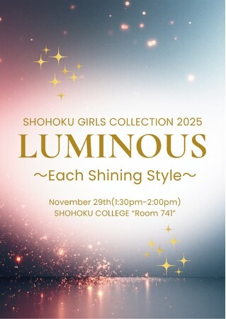 学校法人ソニー学園 湘北短期大学(厚木市温水428、理事長・学長 高橋 洋)は、11月29日(土)に「湘北短期大学ファッションショー Luminous ~Each Shining Style~」を開催します。2004年の第1回から今回22回目を迎えます(コロナ禍ではオンライン開催)。例年同様、生活プロデュース学科の2年生を中心に、総合ビジネス・情報学科の学生を合わせて総勢50名弱の学生が、衣装製作からショーの構成・出演・舞台美術・映像などによる演出まですべて手作りで運営する学科横断のイベントです。衣装や子ども服の製作、空間演出、イベントの企画・運営など生活プロデュース学科と総合ビジネス・情報学科の学生が専門的に学んできた知識や体験を生かし、学びを通じて磨いてきた個々の創造力と個性を発揮・表現する集大成の機会です。当日のショーでは、太田ゼミ・奥脇ゼミの学生がデザイン・製作した衣装を本人、またはモデル担当の学生15名が身にまといランウェーを歩きます。また、学生が製作したキッズドレスを着た教職員の子どもたちも登場します。